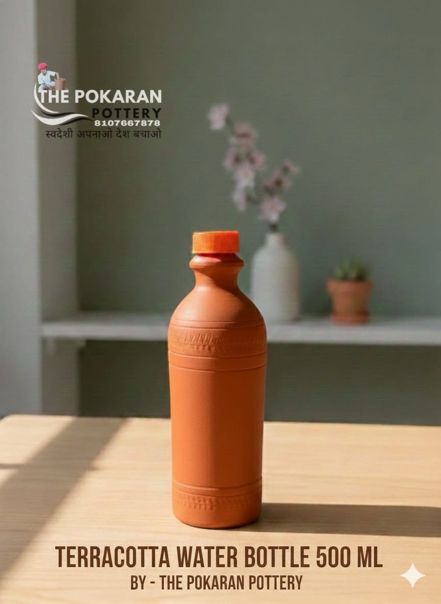 The 500 ML Self-Cooling Clay Bottle is a beautifully handcrafted product made from natural clay, combining traditional Indian pottery with modern daily use. Designed to provide naturally cool drinking water, this bottle can cool water within 7–8 minutes without any electricity or refrigeration, making it an eco-friendly and healthy choice.