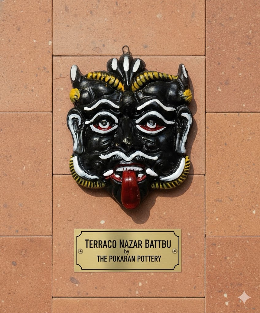 The Clay Nazar Battu is a traditional handcrafted protective decor piece made from natural clay by the artisans of The Pokaran Pottery, Rajasthan. In Indian culture, Nazar Battu has long been used as a symbol of protection to help guard homes, shops, and workplaces from negative energy and the evil eye.