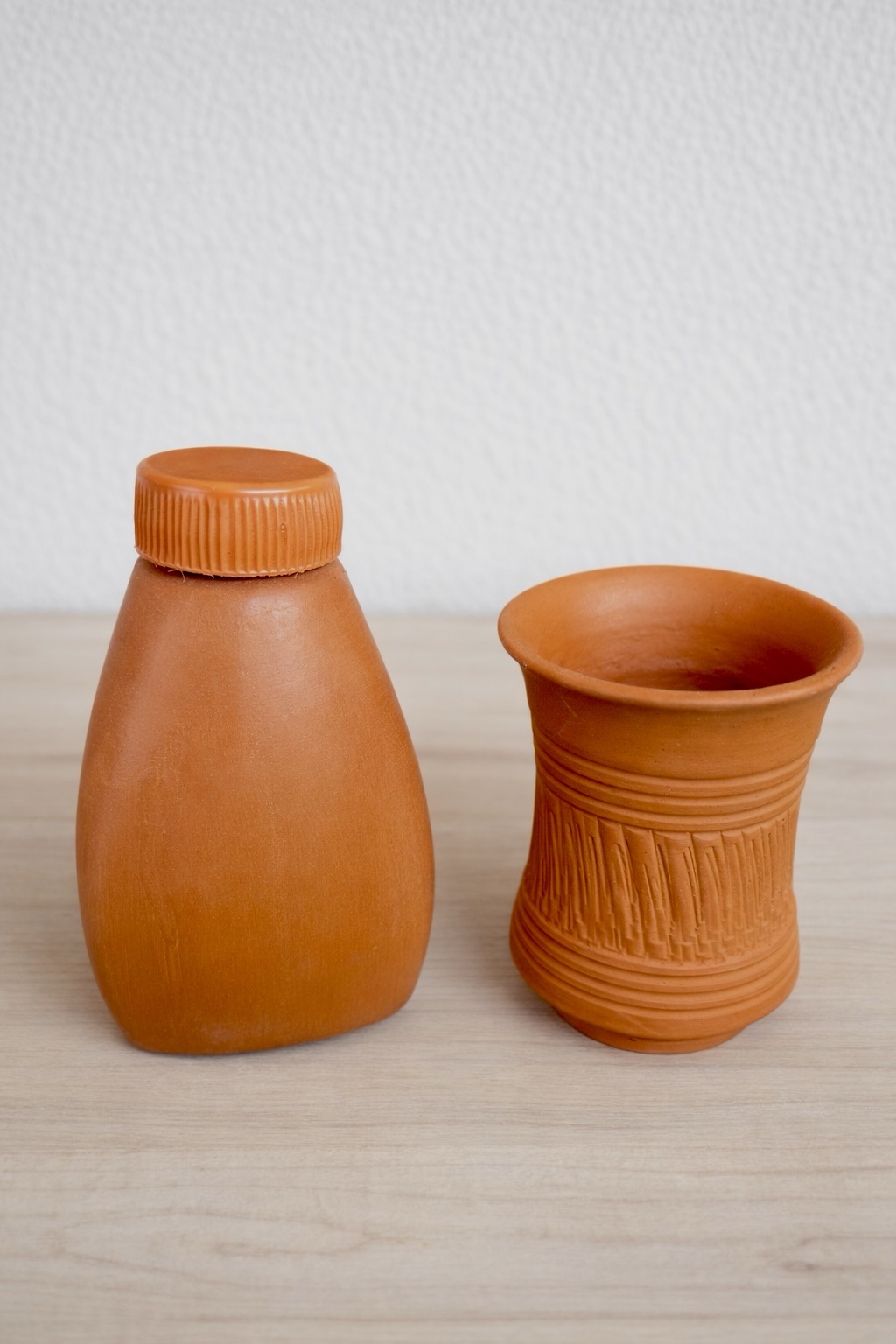 The bottle comes with a matching terracotta glass, giving you a traditional and eco-friendly way to enjoy pure drinking water wherever you go.