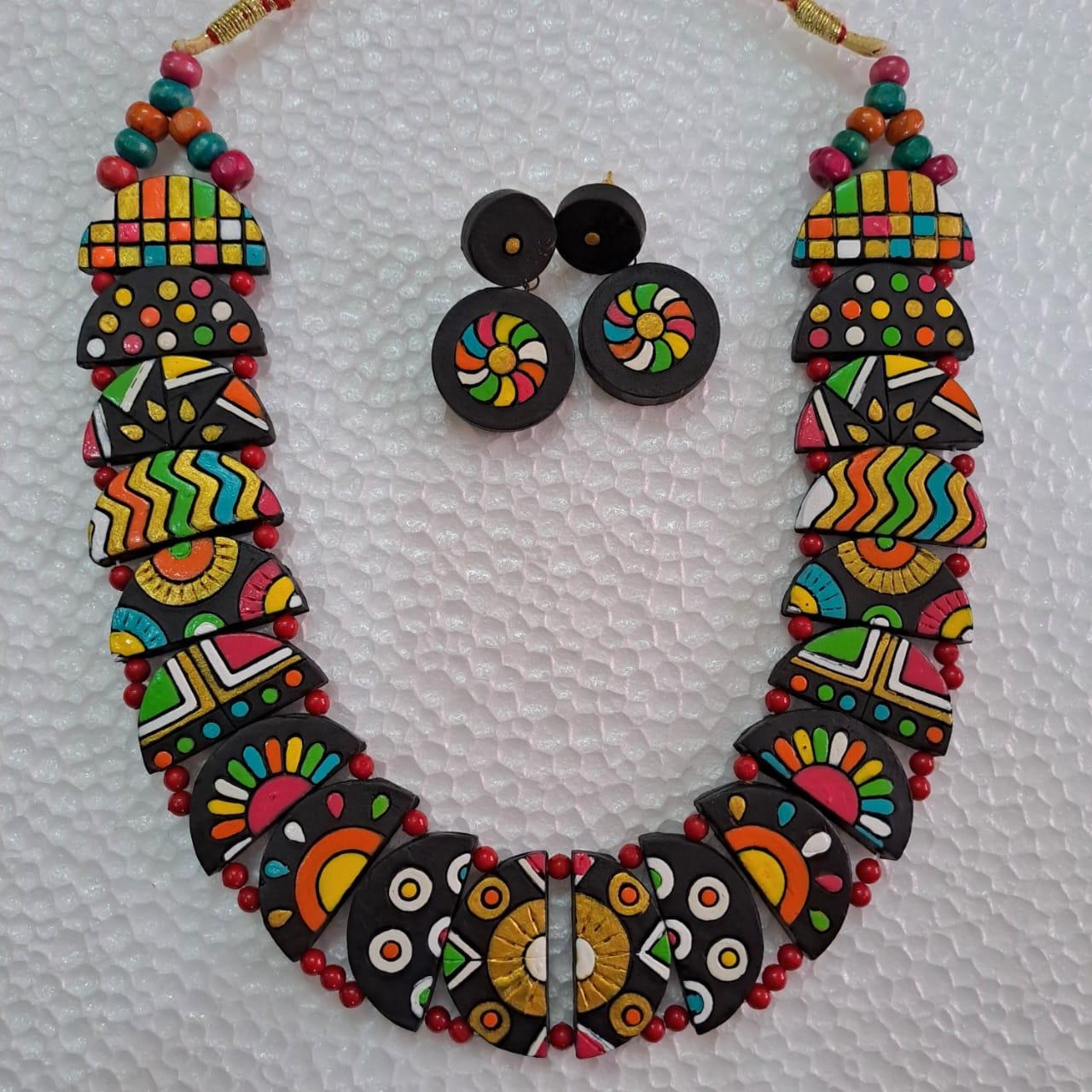 This beautifully handcrafted terracotta jewelry set is made from natural clay and finished with hand-applied colors, giving each piece a unique and artistic touch. The set includes a pair of earrings and a matching necklace, perfectly designed to complement each other.