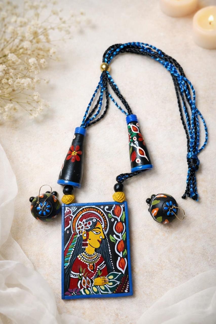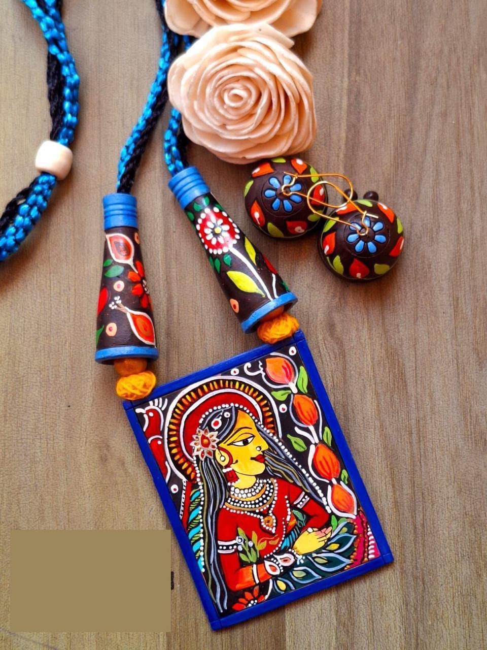 This beautifully handcrafted terracotta jewelry set is made from natural clay and finished with hand-applied colors, giving each piece a unique and artistic touch. The set includes a pair of earrings and a matching necklace, perfectly designed to complement each other.