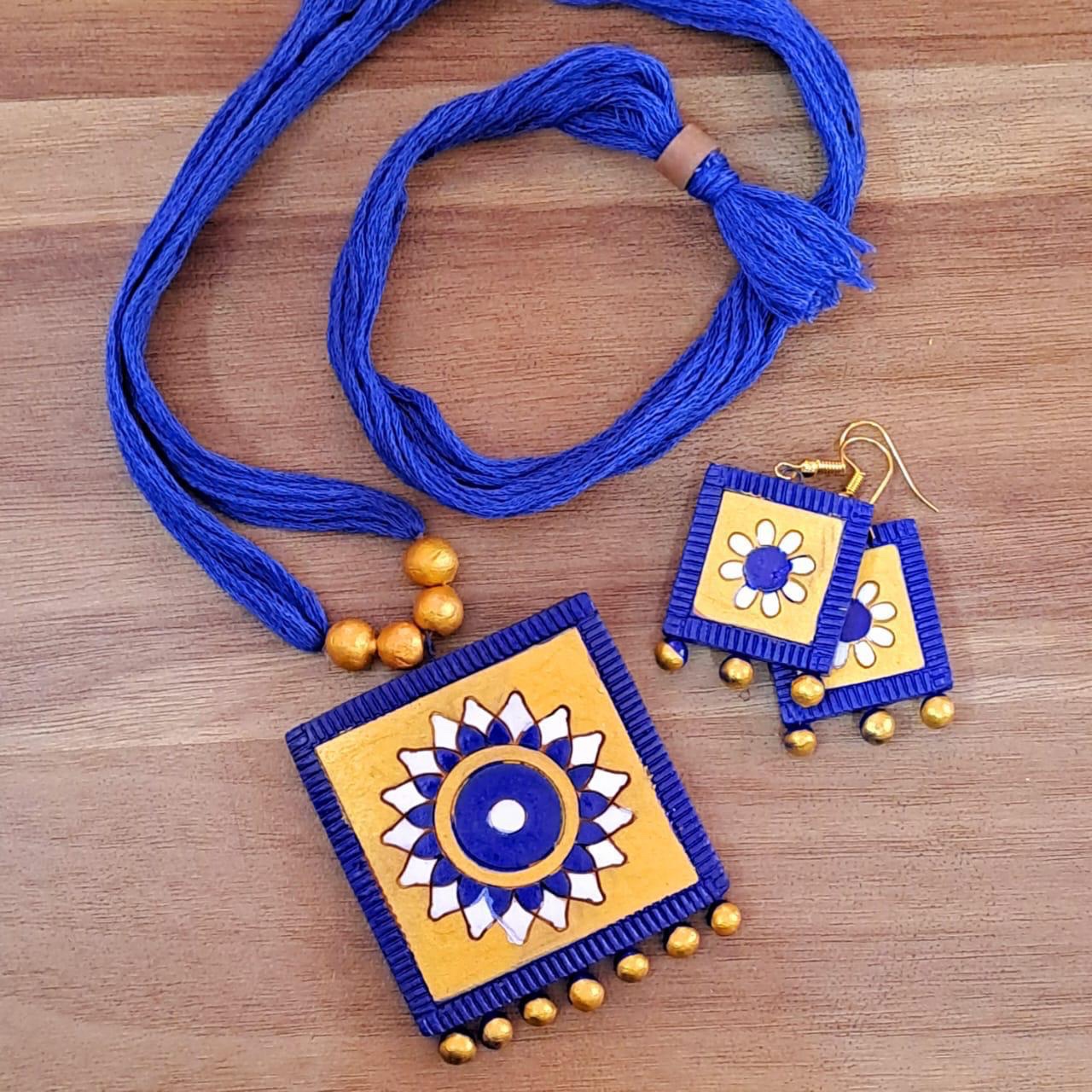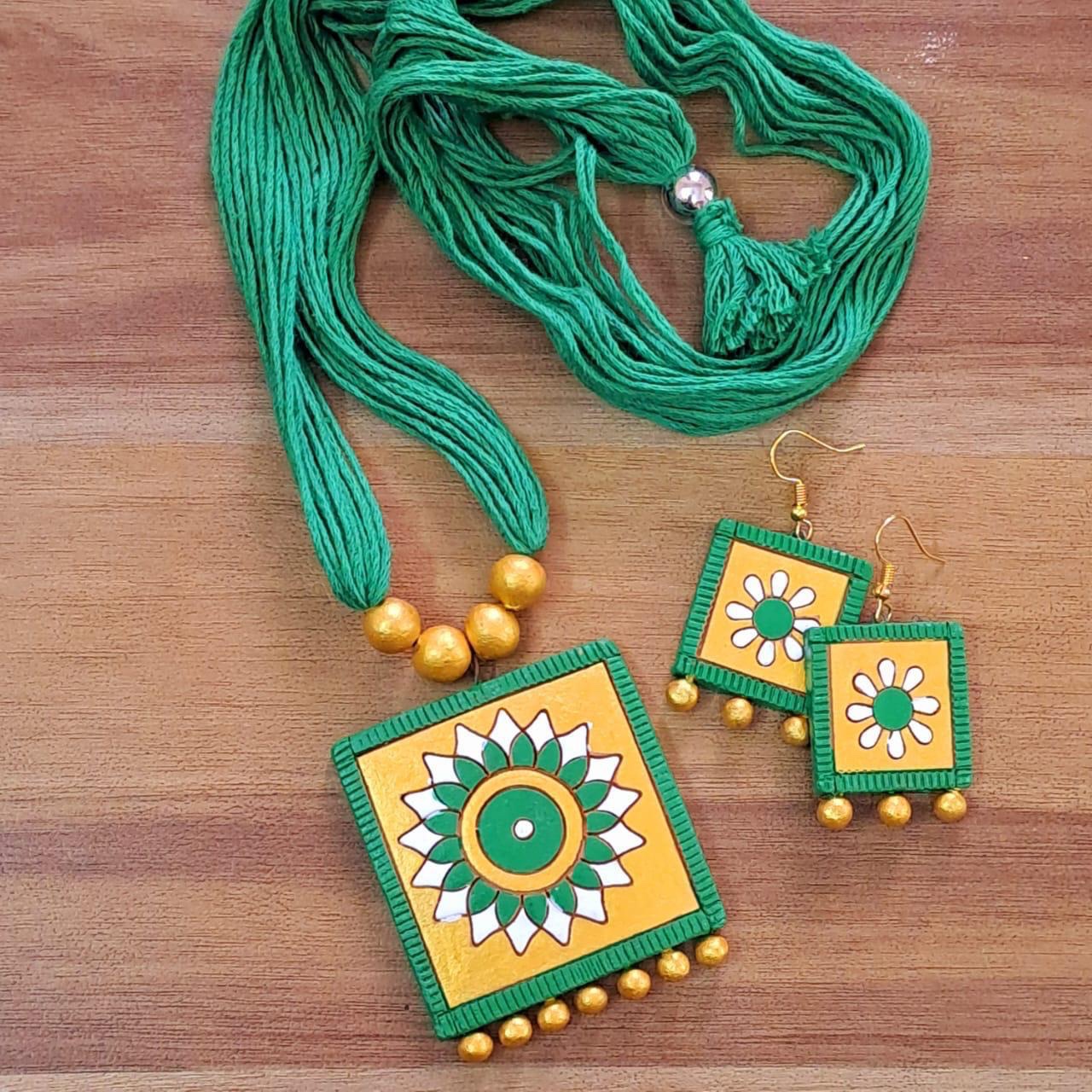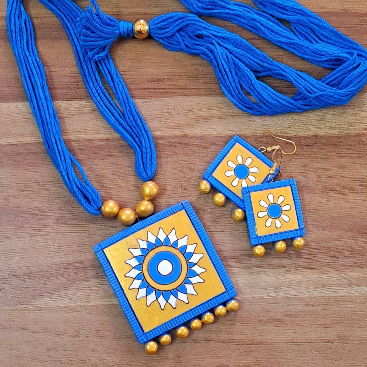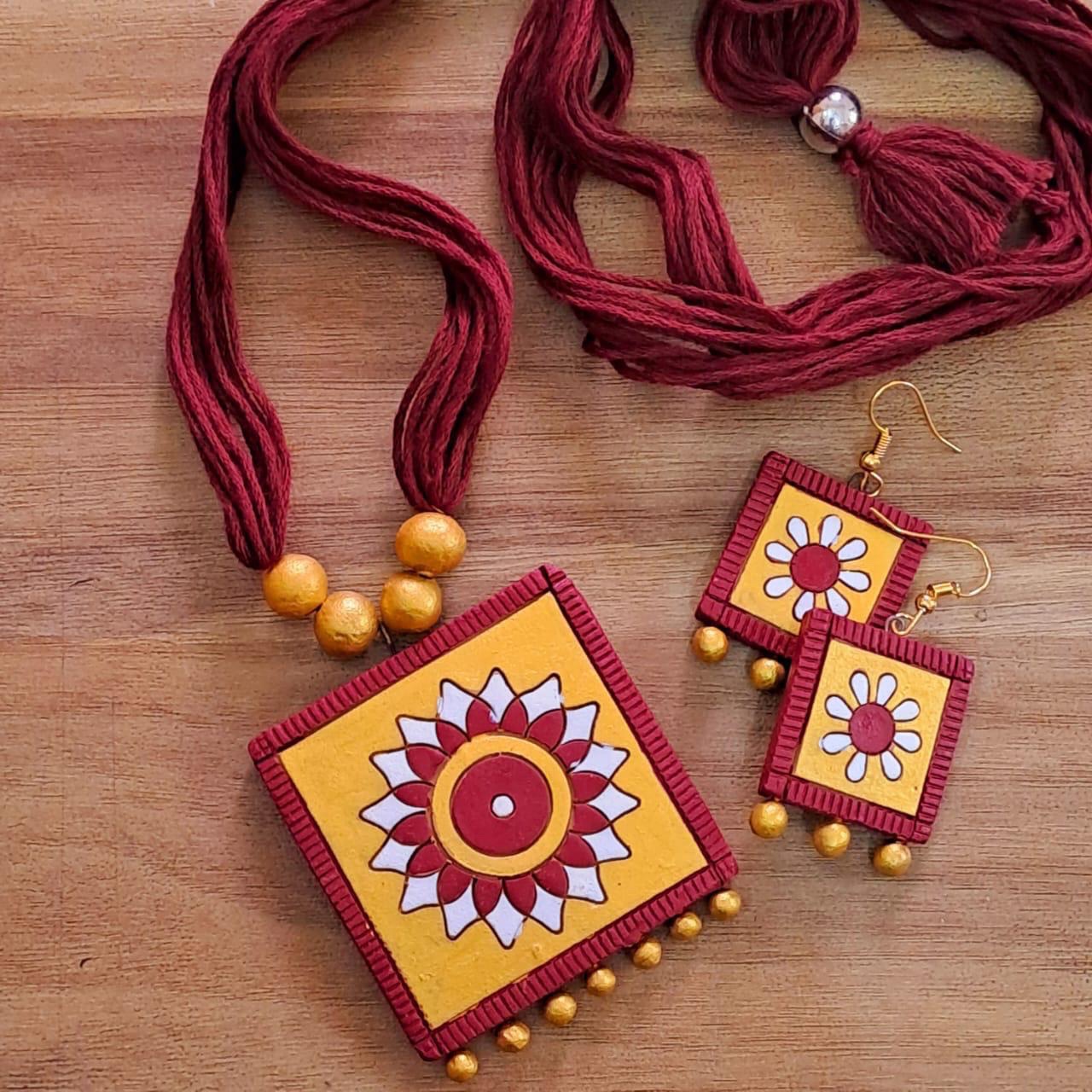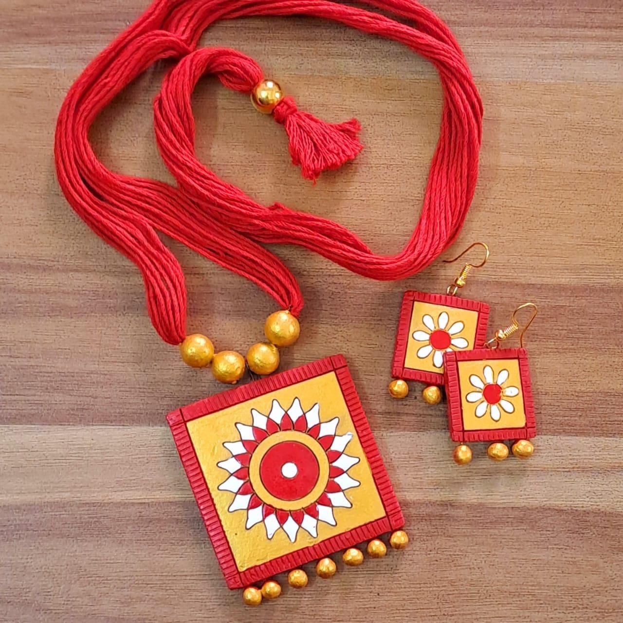 This beautifully handcrafted terracotta jewelry set is made from natural clay and finished with hand-applied colors, giving each piece a unique and artistic touch. The set includes a pair of earrings and a matching necklace, perfectly designed to complement each other.
